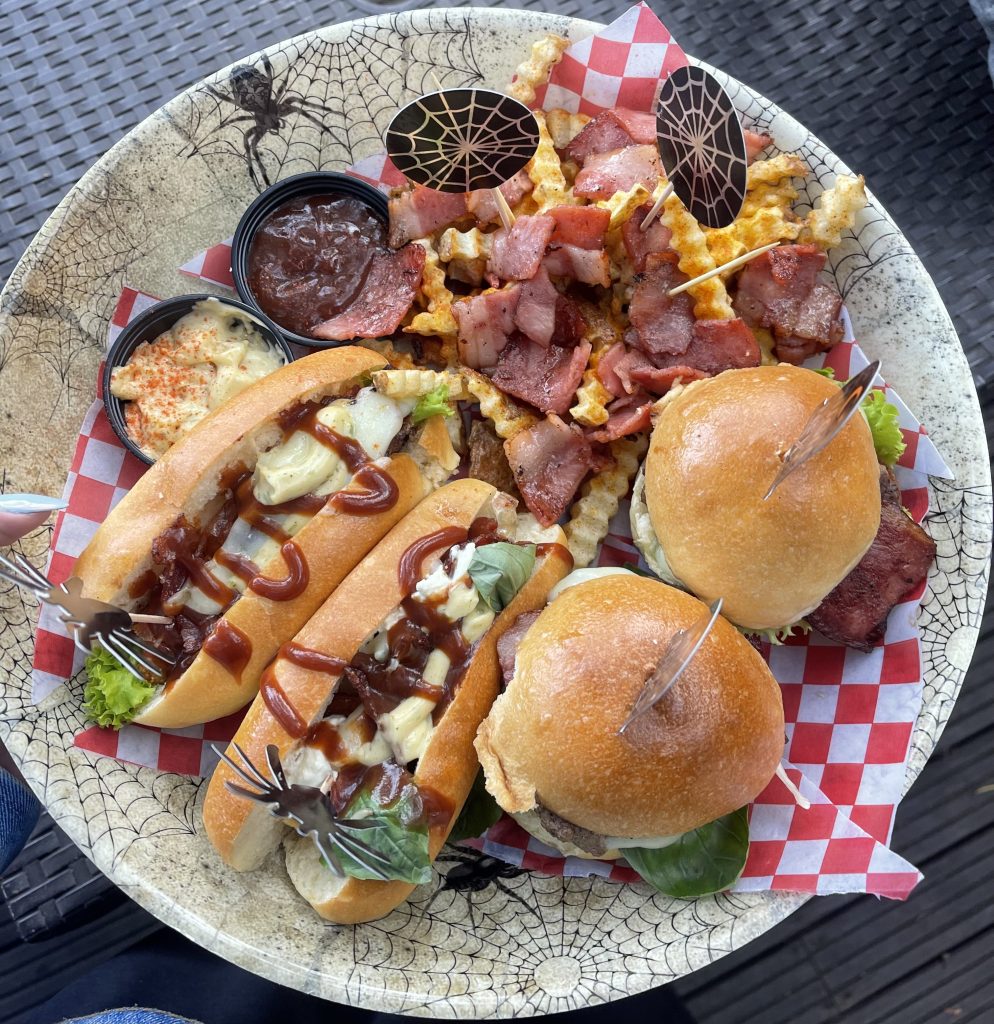 - Mini burger x 2: pan, medallón de carne (60 gr), tocineta confitada, lechuga, tomate, queso mozzarella.