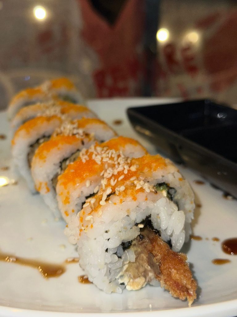 Langostino apanado, aguacate, queso crema, toping de masago y ajonjoli.